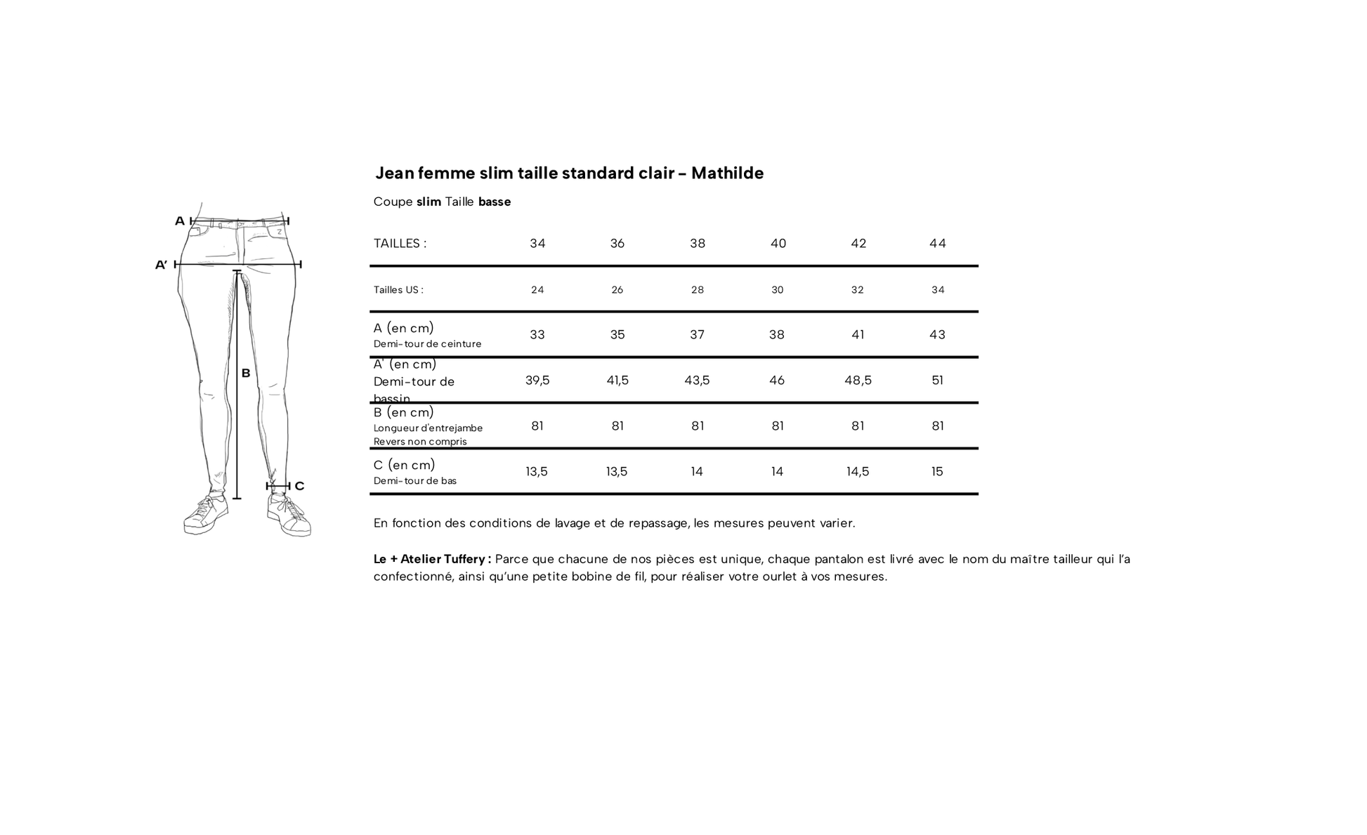 Mathilde est la coupe slim d’Atelier TUFFERY, avec une taille basse modérée. Très féminin, en authentique toile denim, légèrement stretch pour le confort, ce modèle est agrémenté de surpiqûres rouges.